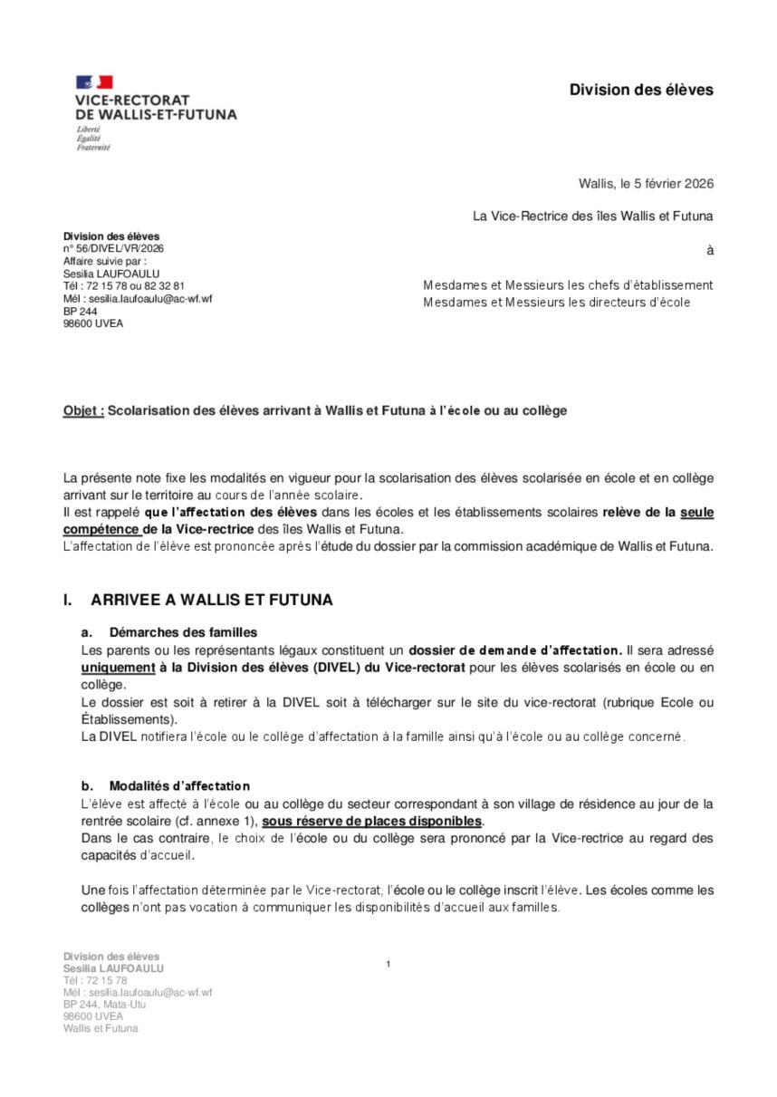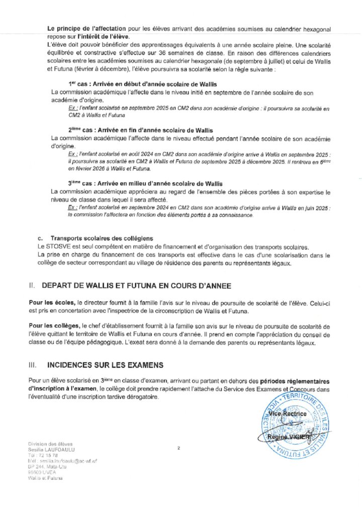 Circulaire : Scolarisation des élèves arrivant à Wallis et Futuna à l’école ou au collège