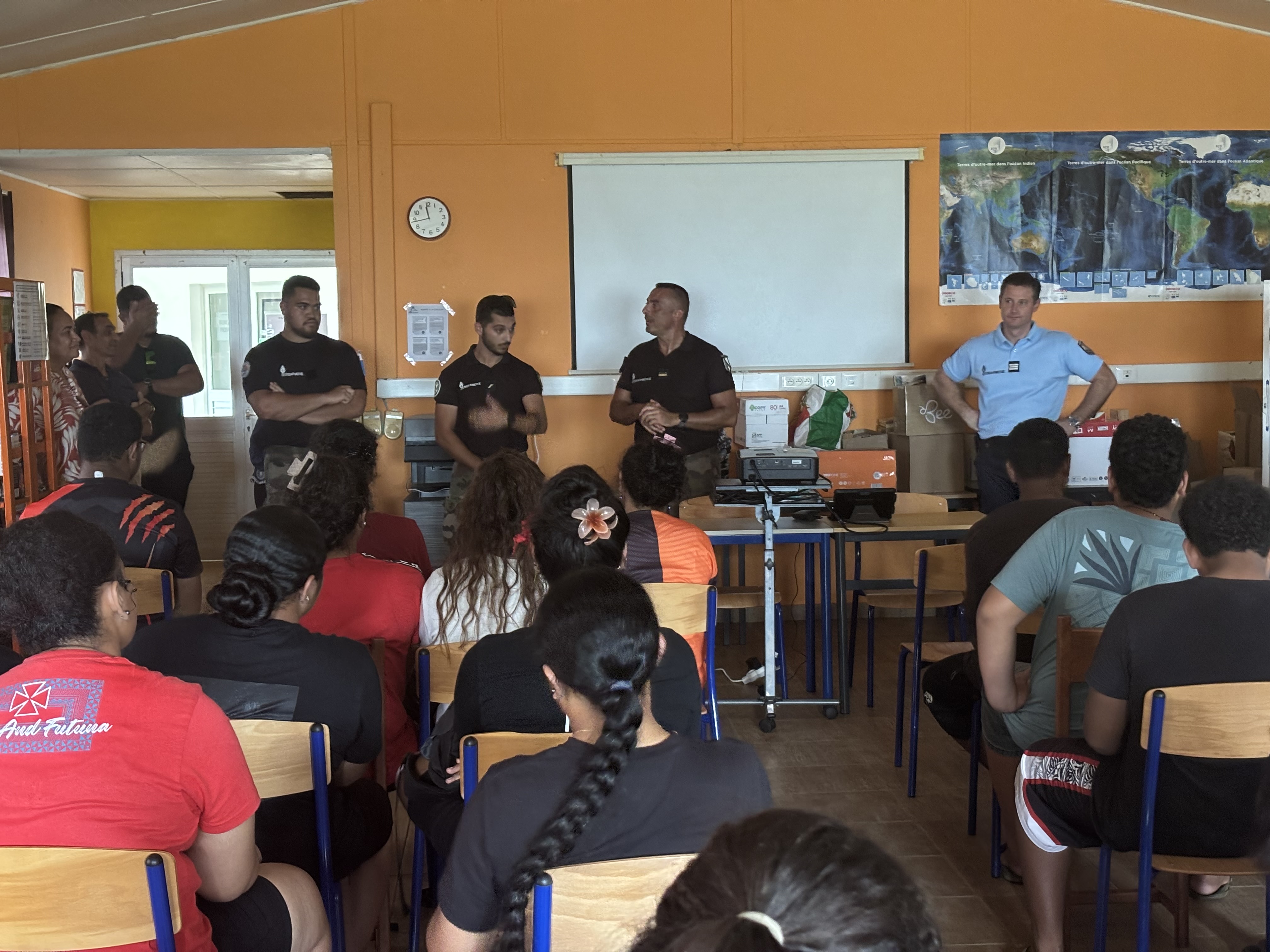 À l’issue de la présentation théorique, les élèves ont participé à un parcours de cohésion, qui a réuni les élèves de 3e du Collège de Malae et ceux de 2de professionnelle du Lycée d’État. Ce moment de partage et de coopération a permis aux jeunes de renforcer leur esprit d’équipe et de solidarité, deux valeurs fondamentales dans le cadre du programme des Classes Défense.