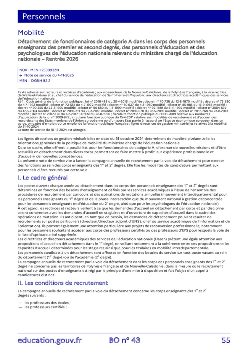 À l’approche de la rentrée 2026, le ministère chargé de l’Éducation nationale met en place une procédure de détachement destinée aux fonctionnaires de catégorie A. Cette mesure vise à renforcer l’attractivité des métiers de l’Éducation en permettant à des personnels expérimentés et qualifiés de rejoindre les corps des enseignants du premier et second degrés, des personnels d’éducation ainsi que des psychologues de l’Éducation nationale.